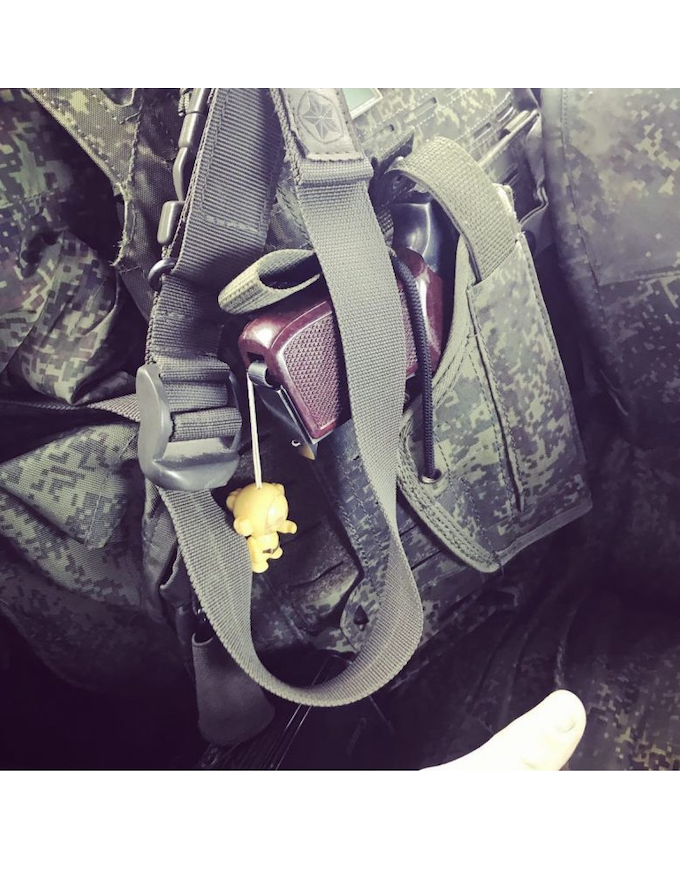 A small yellow puppet hangs from the butt of a gun. The eyes and shorts of the figure that children love are just traces of faded black. “It’s a detail, but it tells what the war is.”