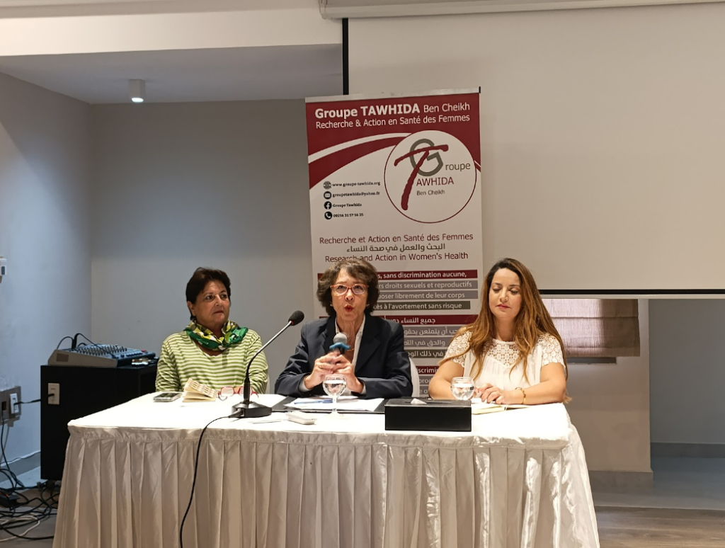 Membres du collectif Tawhida Ben Cheikh lors de la conférence sur le droit à l’avortement à Tunis. Crédit photo : Hajer Ghammaqi