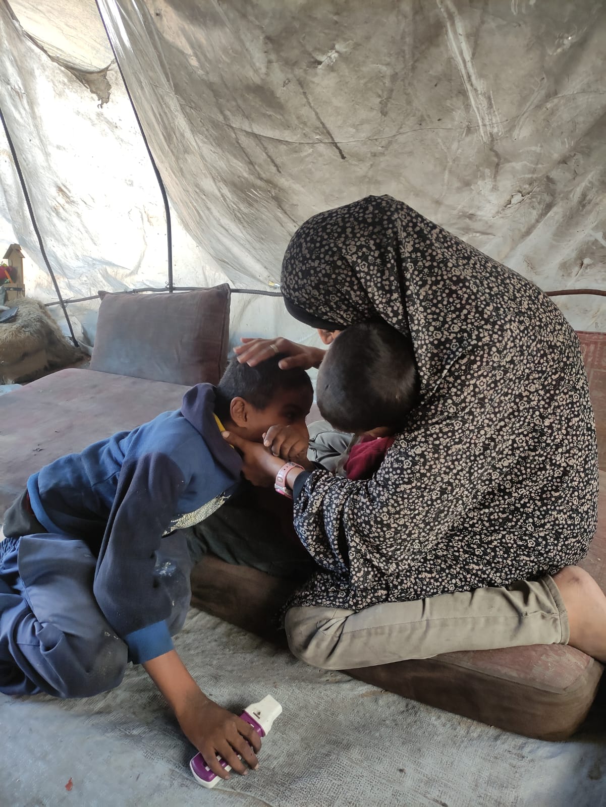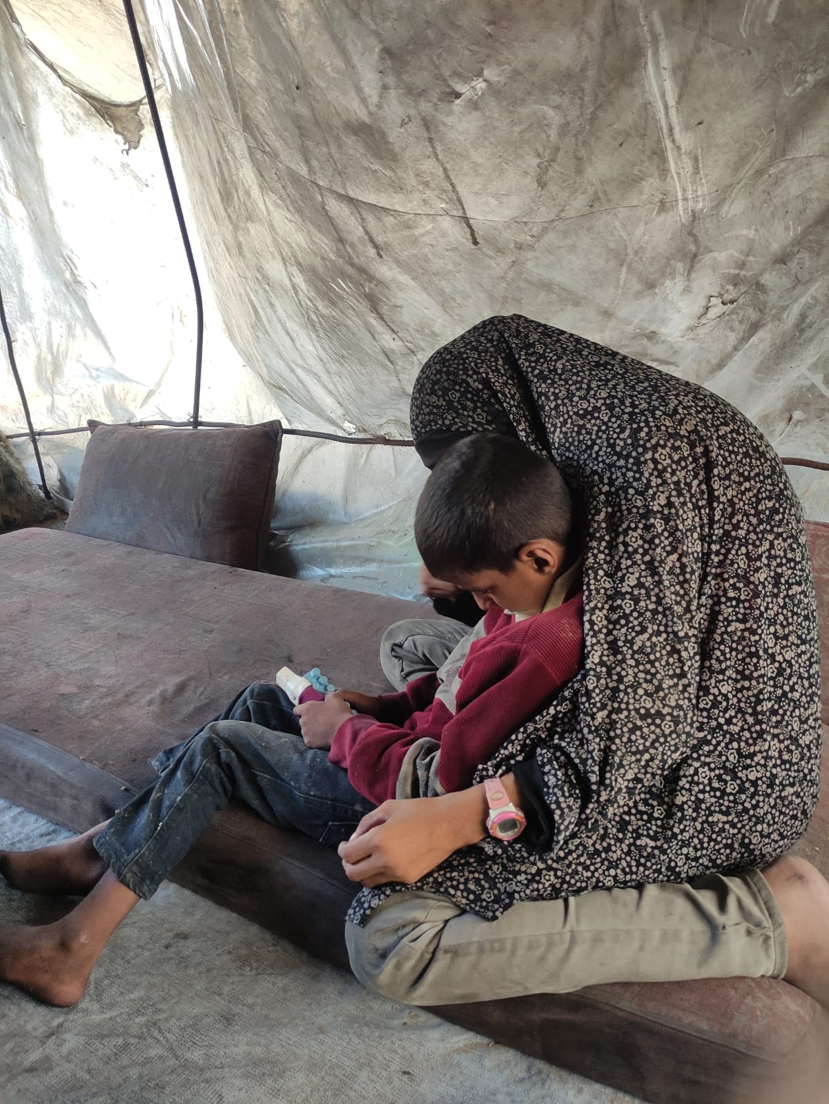 وسط خيمة لا تقي من الحرّ ولا البرد، تعيش أم أحمد مع أربعة أطفال، بينهم أحمد وعمر، كلاهما من ذوي طيف التوحّد. أحمد يعاني نوبات صرع حادّة بسبب فرط الكهرباء في الدماغ، فيما يعاني عمر ضعفاً عضلياً يمنعه من المشي. كلاهما غير ناطقَين، ويتواصلان عبر نظرات وإشارات لا يفهمها سوى قلب أمّهما.