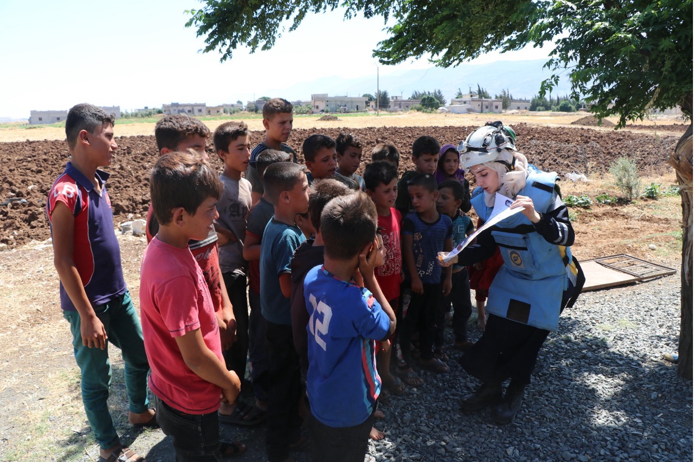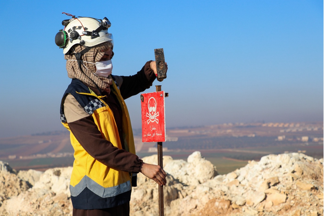 متطوعة من الدفاع المدني تضع إشارة تحذيرية لتنبيه المارة بوجود مخلفات الحرب– المصدر: الدفاع المدني السوري