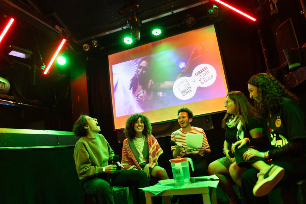 Au cœur de Bruits roses, le Makeda — salle de concerts emblématique du centre-ville de Marseille — a accueilli un moment inédit pour célébrer l’inauguration du festival, conçu avec le collectif Cabaraï, que Justine décrit comme « plus qu’une table ronde, un format un peu hybride », installé « dans une boîte, avec un casque à l’oreille », un dispositif que le Makeda n’avait jamais vu. La thématique : « Raï : la création comme vecteur d’émancipation des jeunes Algérien.nes et de la diaspora ». Les échanges réunissaient Feryal, membre de Cabaraï et engagée pour la sécurité des femmes en milieu festif à Marseille, Faïza alias La Louuve, DJette et exploratrice des musiques populaires algériennes, ainsi que moi-même Amel Hadjadj, fondatrice du Journal Féministe Algérien. La soirée s’est prolongée sous le signe du raï et de ses imaginaires populaires ; la piste s’est transformée en un espace dansant, créatif et collectif, fidèle à la volonté du festival de faire se rencontrer pensée et fête, luttes et joie, paroles et corps libérés.