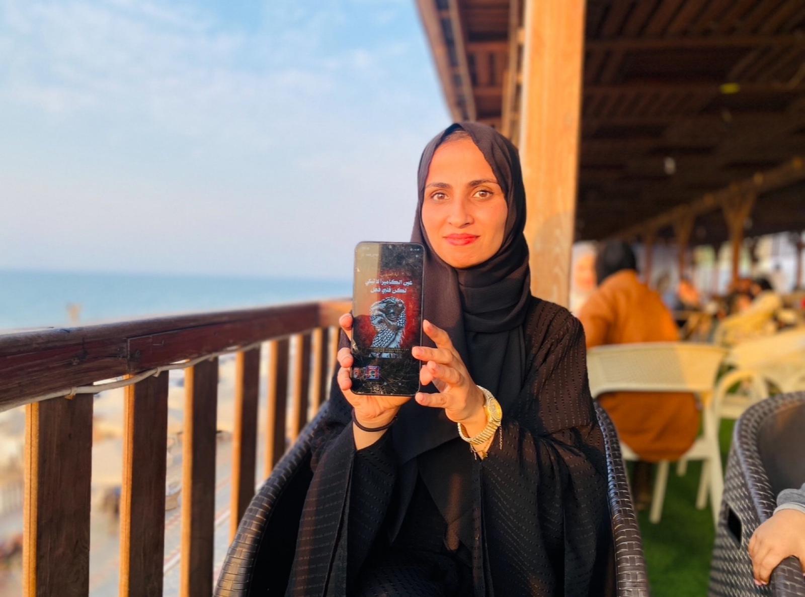 آية العديني تحمل صورة لكتابها – تصوير لميس الأسطل