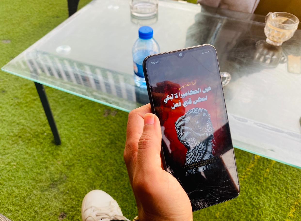 بعد إحدى ليالي التصوير الطويلة تحت القصف، عادت العديني لمراجعة اللقطات، فواجهت مشاهد لم تعد تحتملها. كانت العدسة ثابتة وباردة، تسجّل كل شيء بوضوحٍ قاسٍ، بينما كانت هي خلفها تنهار بصمت. من هنا خرجت عبارة "عين الكاميرا لا تبكي، لكن قلبي فعل".