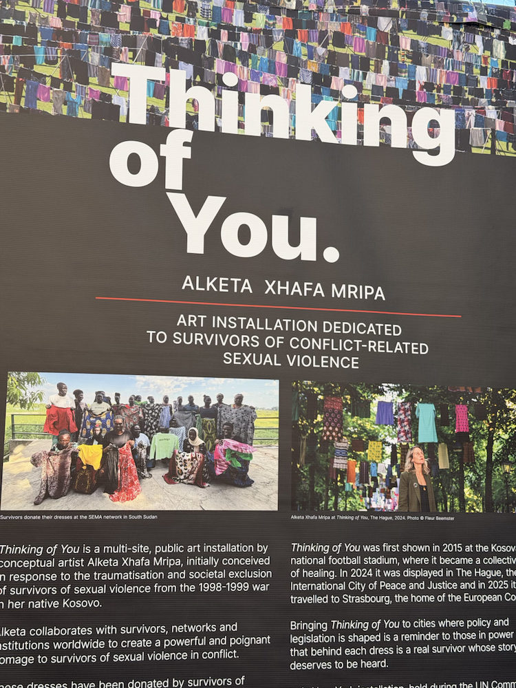 Je m’arrête pour discuter avec Tatiana, originaire de la République démocratique du Congo, l’une des participantes à cette exposition et membre du réseau international des survivantes de violences sexuelles SEMA. « Ces vêtements sont là pour raconter ce que la guerre fait aux femmes », explique-t-elle. Mais l’exposition ne parle pas seulement de violence. Elle évoque aussi la résistance, la résilience et la nécessité de regarder en face les conséquences des conflits qui se poursuivent aujourd’hui.