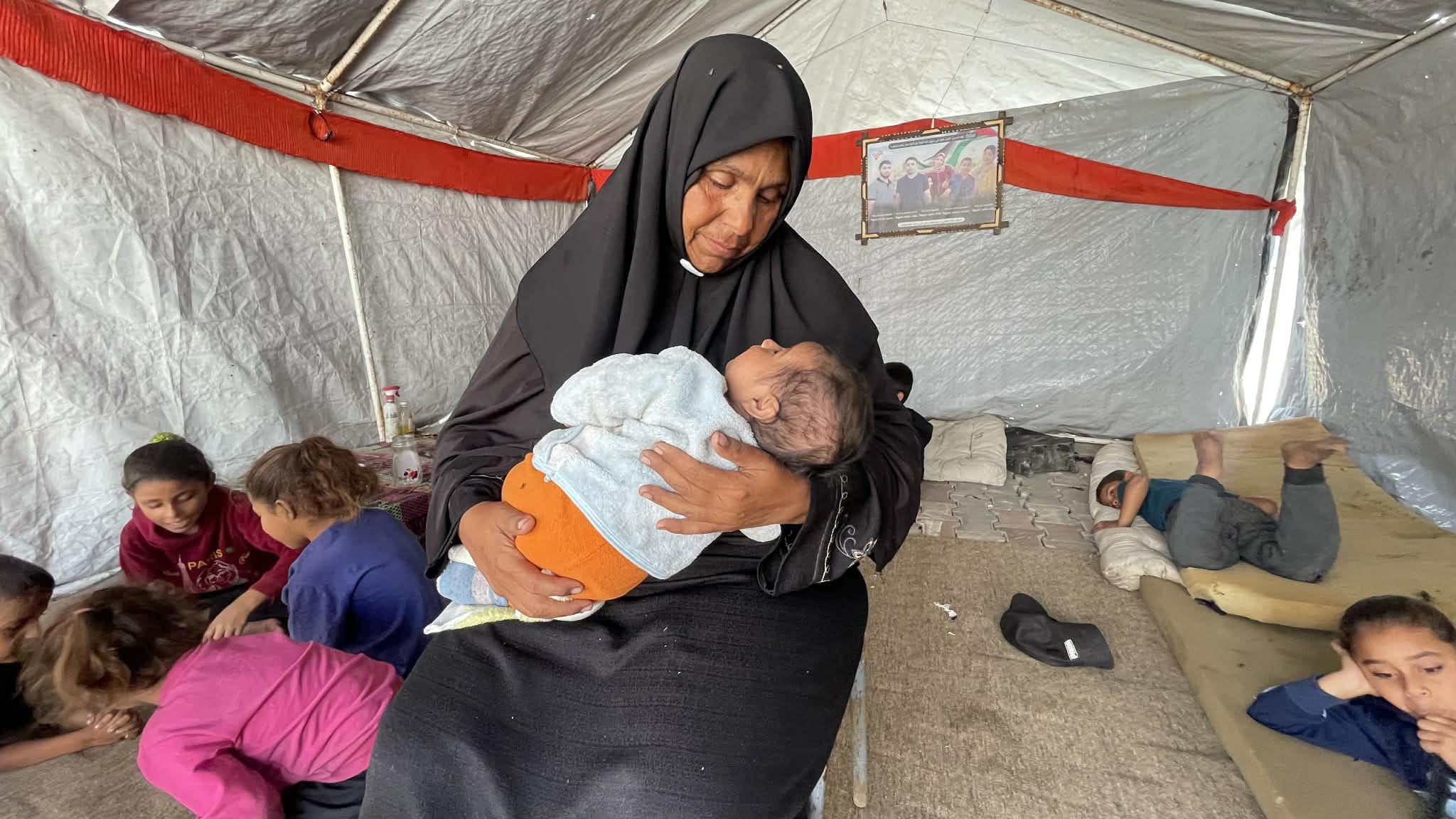 This woman, Amina Abu Nasr, who was displaced from Beit Hanoun in northern Gaza to the Deir al-Balah displacement camps two years ago, plays the role of both mother and father to her three grandchildren after they lost their parents. “The children have become my responsibility,” she says. “They have no one but me, and I have no one but them. I lost two of my sons, and their wives, during the war. I take care of these children and have truly come to understand what people say—that the only thing more precious than a child is a grandchild. I try to support them despite the pain and sorrow inside me, despite all the loss and grief.”